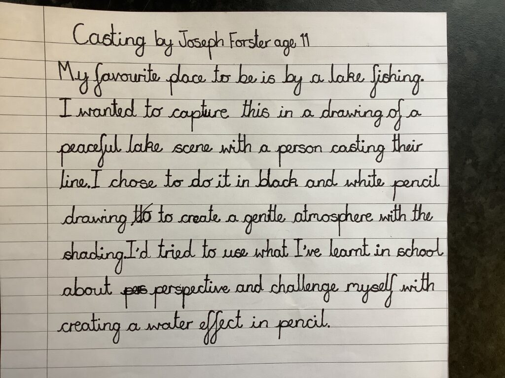 Take a look at Joseph from 6C’s incredible entry for the Young Artists’ Summer Show. He has captured one of his favourite places so beautifully with the use of gentle sketching and exquisite detail. I am so impressed by the focus, care and perspective used in this piece. Well done, Joseph.
