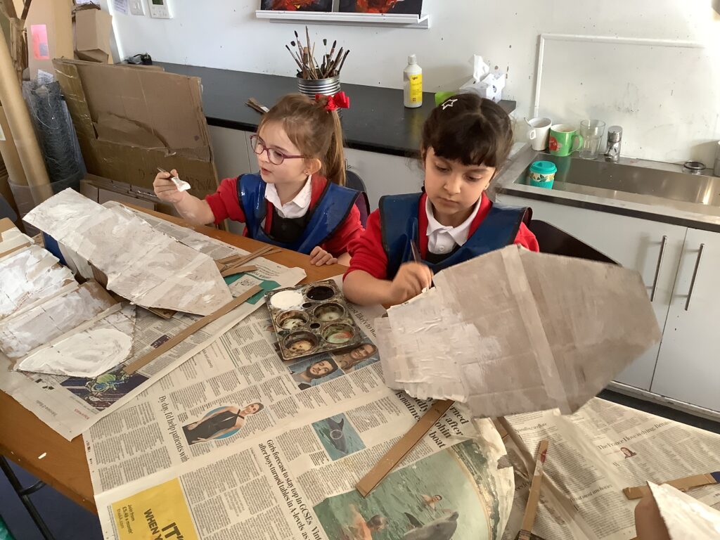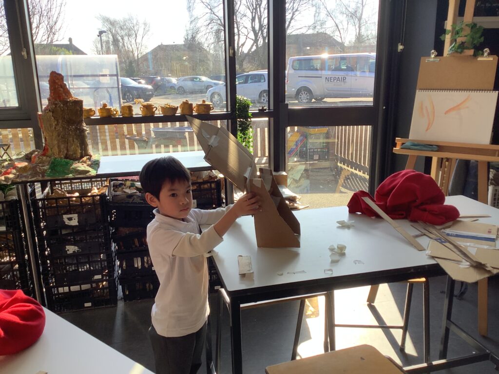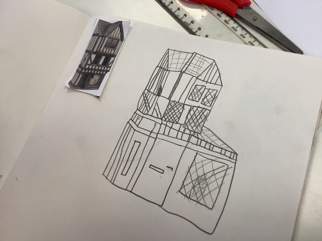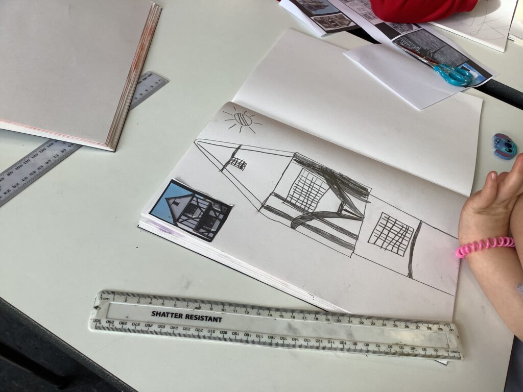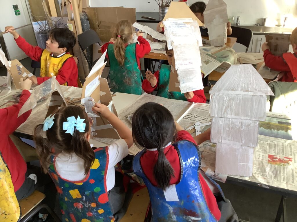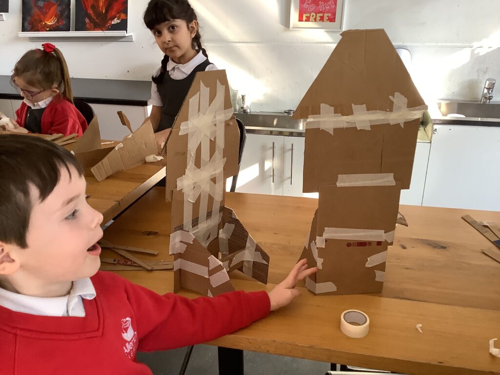 In Week 2, we shifted our focus to the 3D element of our Arts Fortnight. Building on their knowledge of Tudor houses, the children began constructing their own façades, carefully layering overhanging tiers to reflect the distinctive architectural style. One afternoon was dedicated entirely to collaboration, as pairs worked together to design and build freestanding stands to support their houses. This proved to be a real resilience challenge, as we intentionally gave very little guidance to encourage problem-solving and perseverance. It was fantastic to see how well the children rose to this, supporting each other and adapting their ideas when things didn’t quite go to plan.