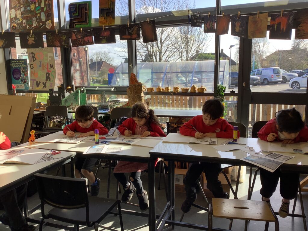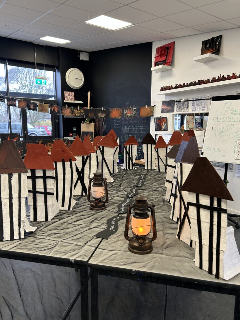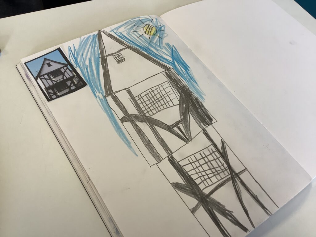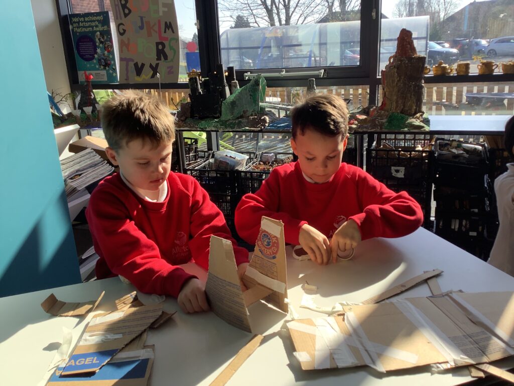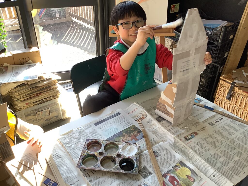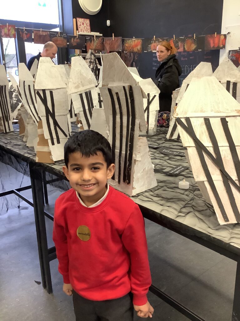 In Week 2, we shifted our focus to the 3D element of our Arts Fortnight. Building on their knowledge of Tudor houses, the children began constructing their own façades, carefully layering overhanging tiers to reflect the distinctive architectural style. One afternoon was dedicated entirely to collaboration, as pairs worked together to design and build freestanding stands to support their houses. This proved to be a real resilience challenge, as we intentionally gave very little guidance to encourage problem-solving and perseverance. It was fantastic to see how well the children rose to this, supporting each other and adapting their ideas when things didn’t quite go to plan.