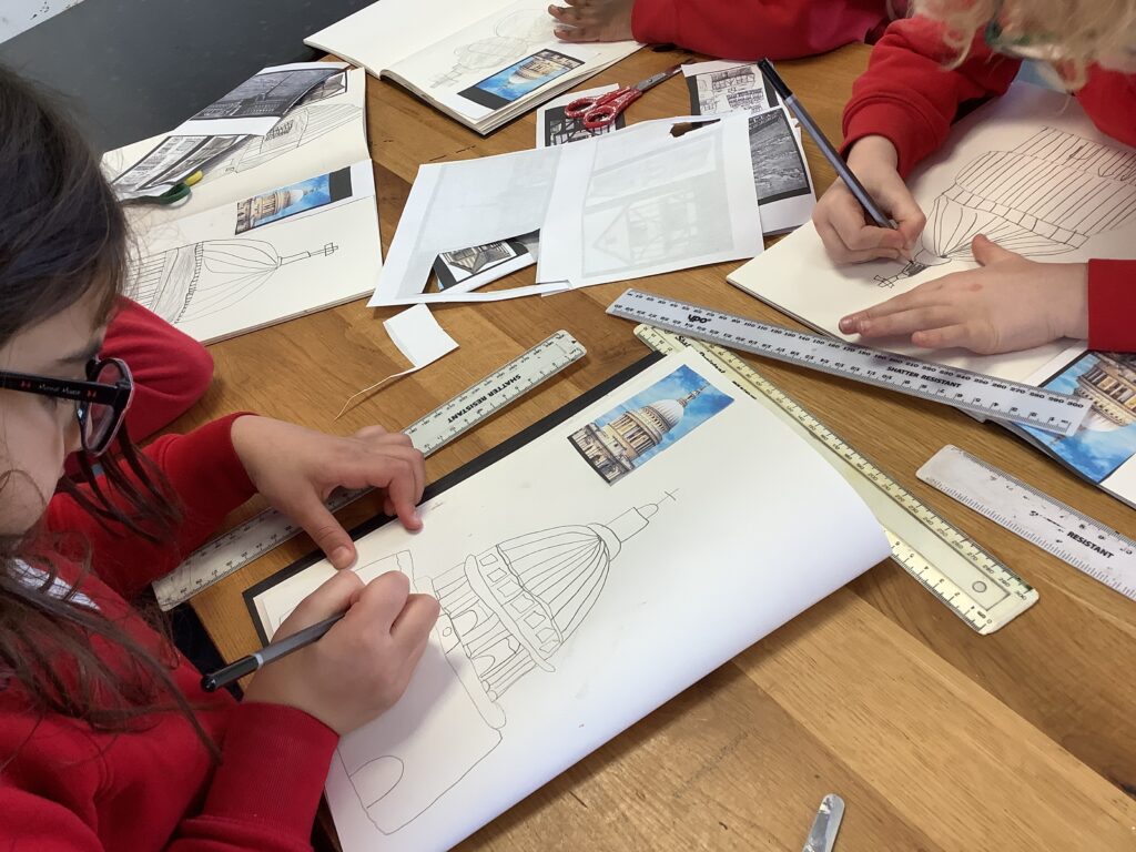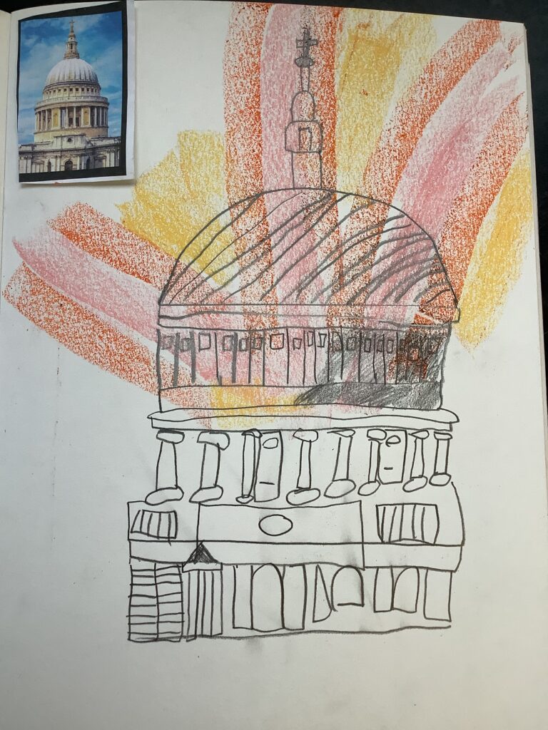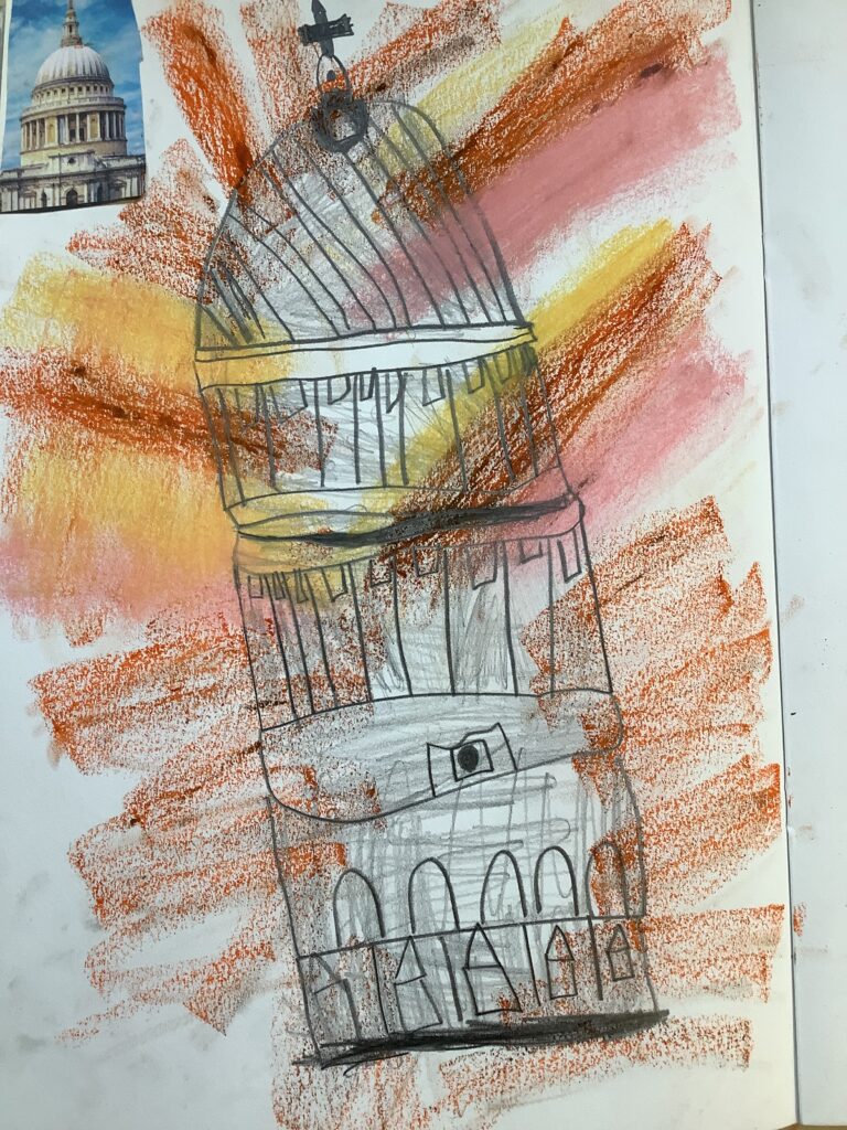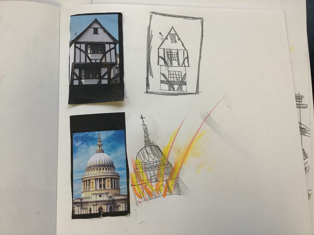 Over their Arts Fortnights, Year 1 immersed themselves in a vibrant and creative Arts Fortnight, and what a fantastic start we had. We began by exploring the history of the Great Fire of London, learning about how the city looked before and after this significant event. The children carefully identified key features of Tudor architecture, noticing the distinctive timber frames and overhanging upper floors. They then had the opportunity to sketch their own Tudor houses, as well as St Paul’s Cathedral, choosing whether to depict them before or after the fire. To bring a sense of drama and storytelling to their work, the children added a touch of peril using oil pastels, experimenting with expressive, gestural movements to capture the energy and danger of the flames. We used graphite pencil, sketching pencil, rulers and pastel.