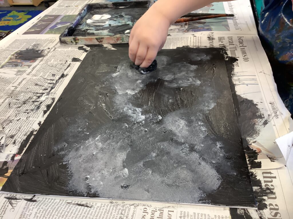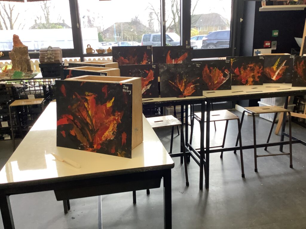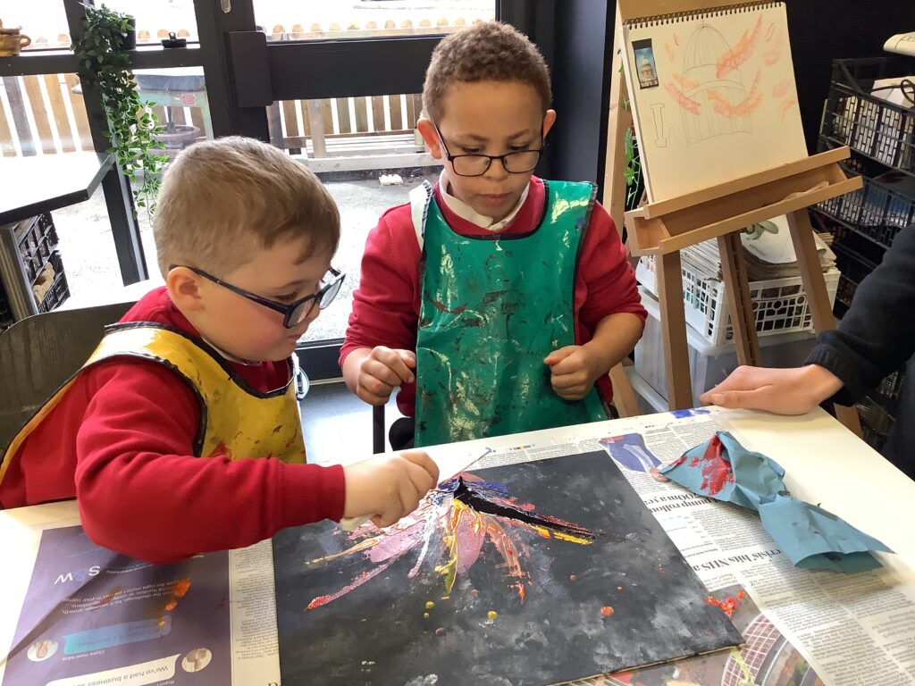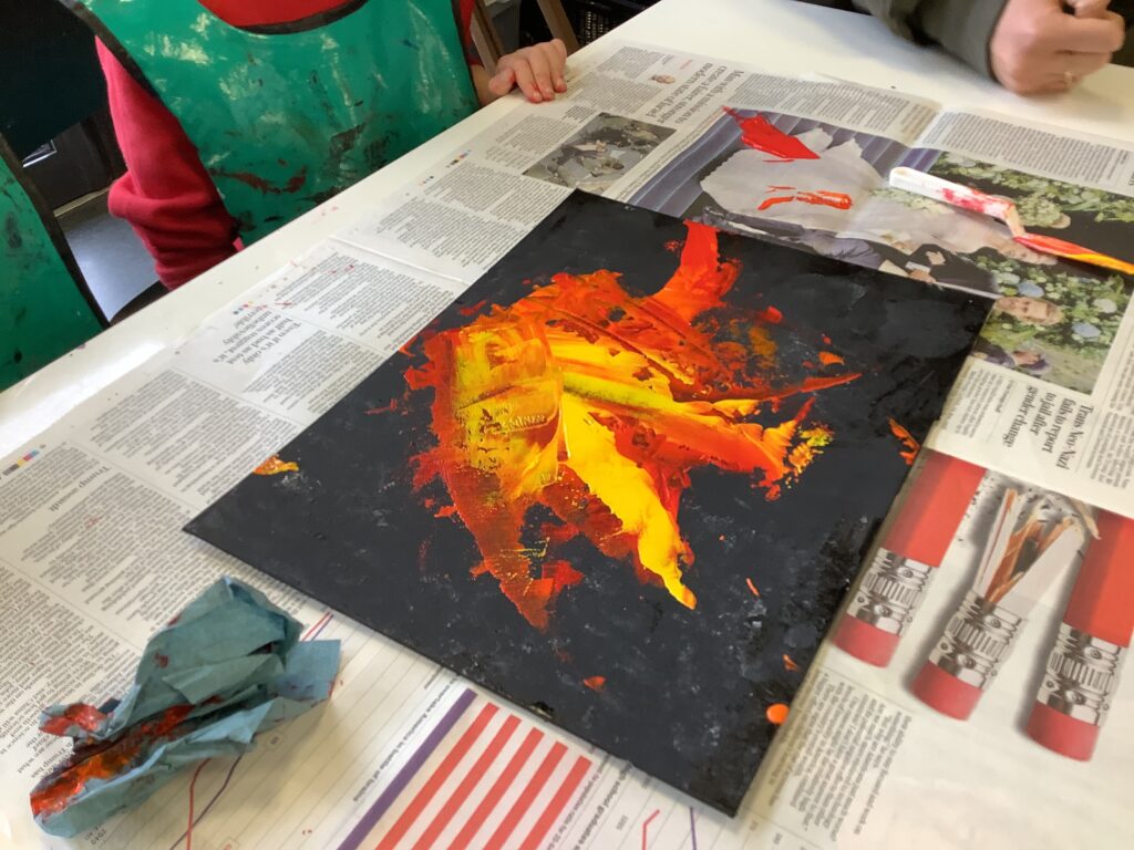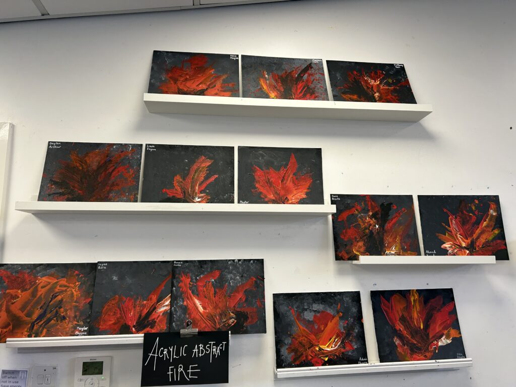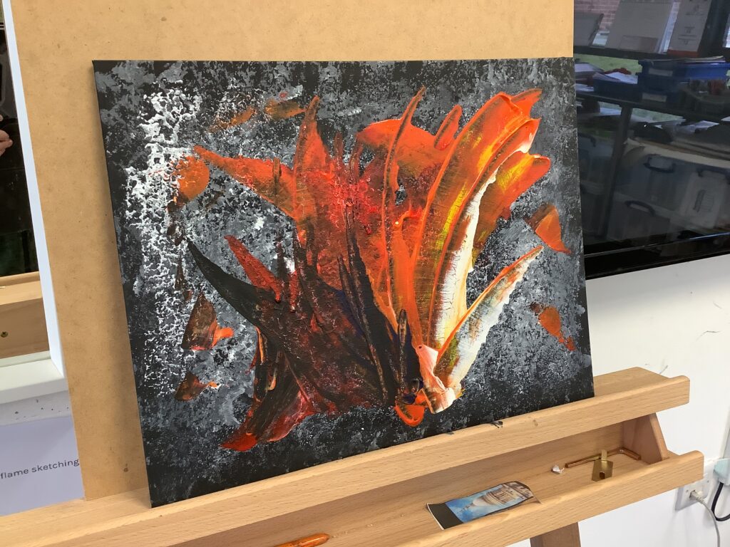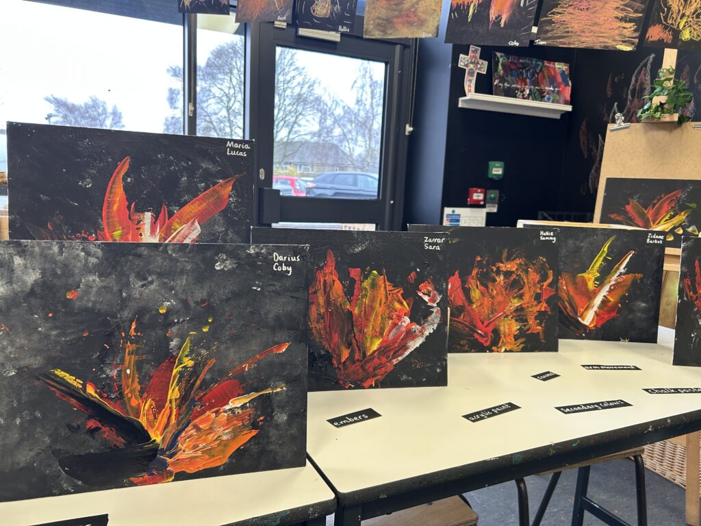 We then moved on to working with canvases to create our own abstract acrylic fire pieces. To begin, the children used blotting techniques and sponges to build a smoky background, working collaboratively and supporting one another brilliantly – our blue relationship orb was well and truly “switched on” all afternoon! It was lovely to see such thoughtful partner work, with children sharing ideas and offering kind compliments to each other at the end of the day. The following session, we introduced palette knives and explored how artists use them to spread and layer paint. We revisited our knowledge of primary and secondary colours and thought carefully about the bold, gestural movements needed to create a wild and intense fire effect. Taking turns, the children swept acrylic paint across their canvases, making decisions about which shades to begin with and how to build up their composition. The results were incredibly striking – so much so that many parents commented they would love to hang the finished pieces at home!