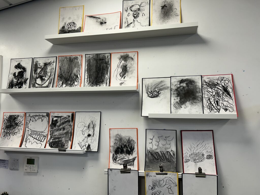 Outside, we also had the opportunity to carry out some observational pastel and charcoal sketches of flames, using the fire pit with the help of Mrs Whittaker! It was really interesting to see how the children smudged and blended to represent the smoke and movement of the flames. I love how some look so abstract and others follow continuous lines through the observational focus.