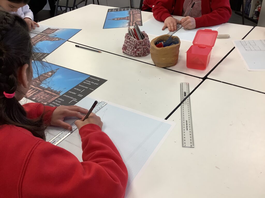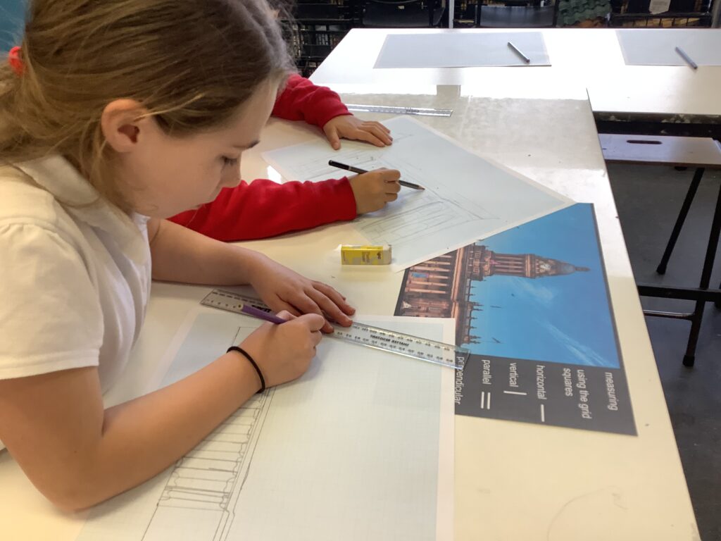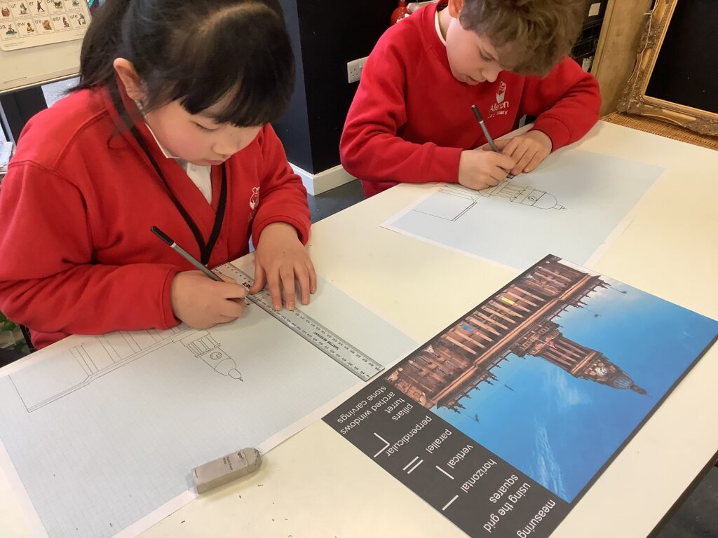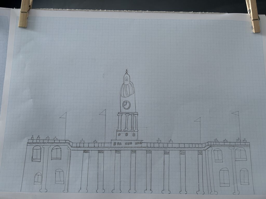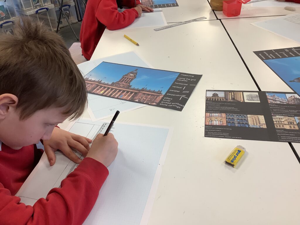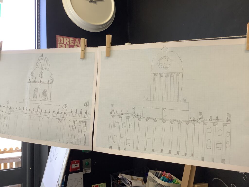 We were also lucky enough to watch an inspiring video from a parent in our school community who runs her own architecture business. This gave the children a real insight into what it takes to be an architect and where to begin with technical drawing. Back in the classroom, we modelled how to use rulers and technical drawing paper, focusing on symmetry and key mathematical concepts such as parallel, perpendicular, horizontal, vertical and diagonal lines. It was a highly focused and thoughtful afternoon, with children carefully observing, adjusting and refining their work to produce detailed drawings of Leeds Town Hall. The final pieces were truly impressive; many adults couldn’t believe they were created by Year 3 pupils! We also used a closed AI system to demonstrate how designs can be developed further using technology, bringing their ideas to life in new ways.