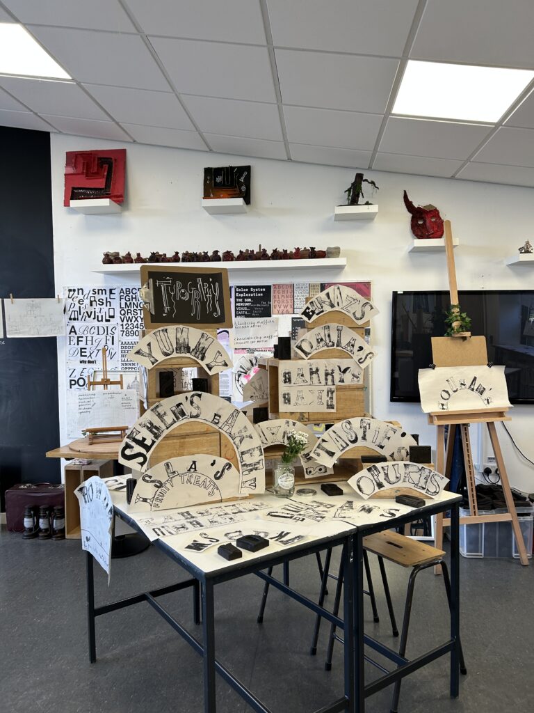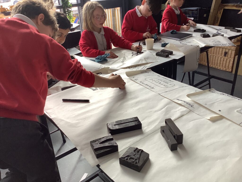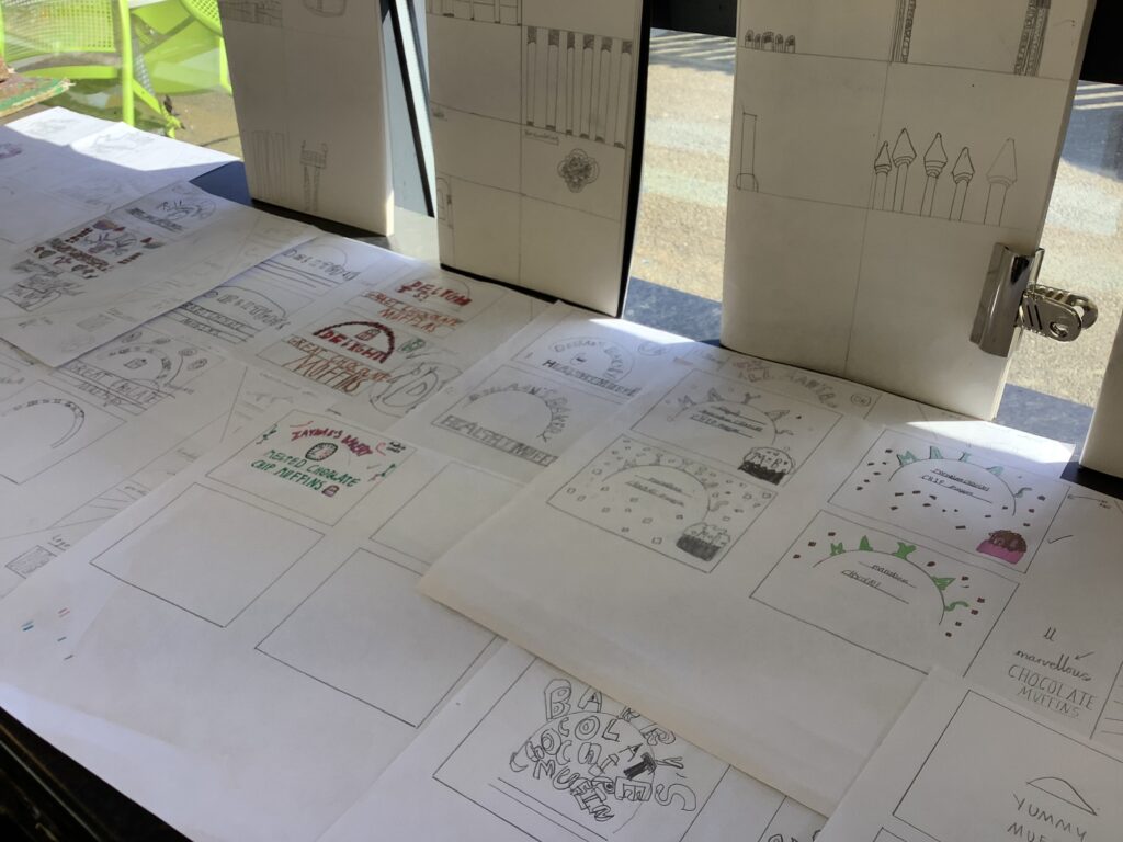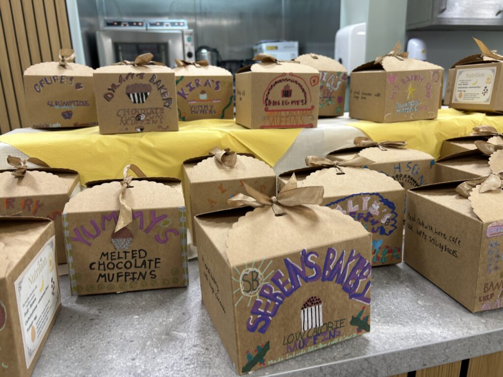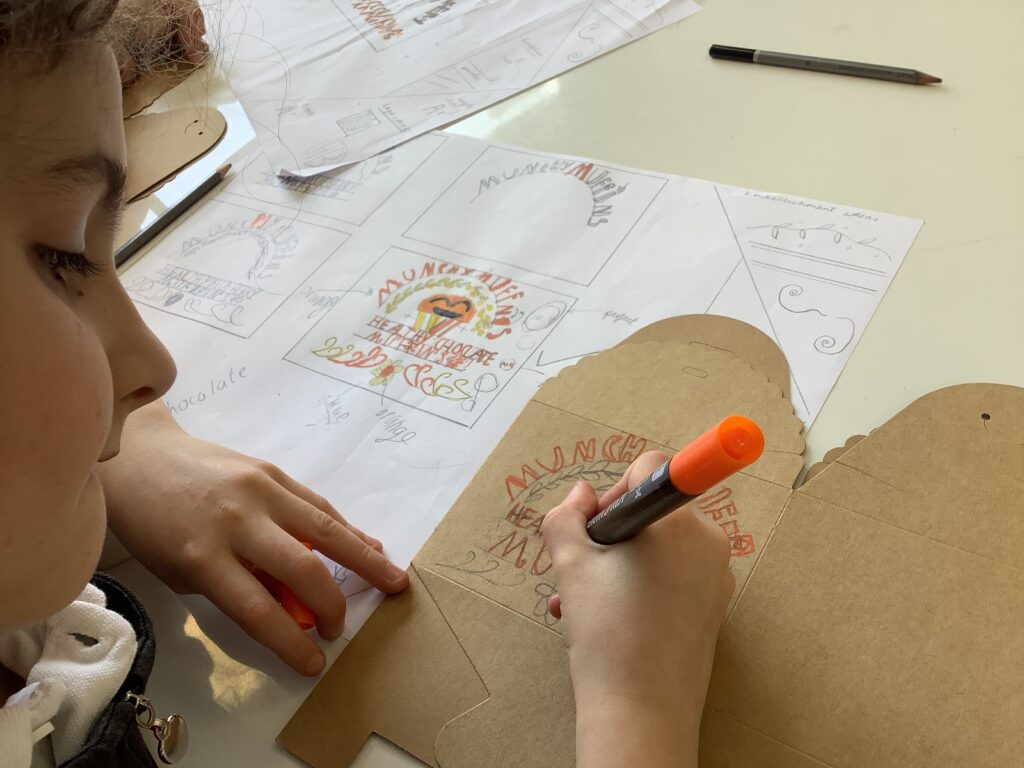 From architecture, we moved into product design and typography. In the café, the children worked with Mrs Elliott to bake either healthy blueberry or chocolate chip muffins, which became the perfect springboard for launching their own bakery businesses. They began by creating a business name and product name, before exploring existing bakeries and discussing what makes branding effective. As a first step into design, the children experimented with letterpress blocks, considering layout techniques such as arcs and parallel lines to present their business names in visually appealing ways.