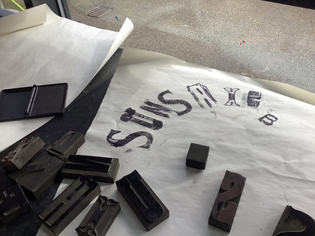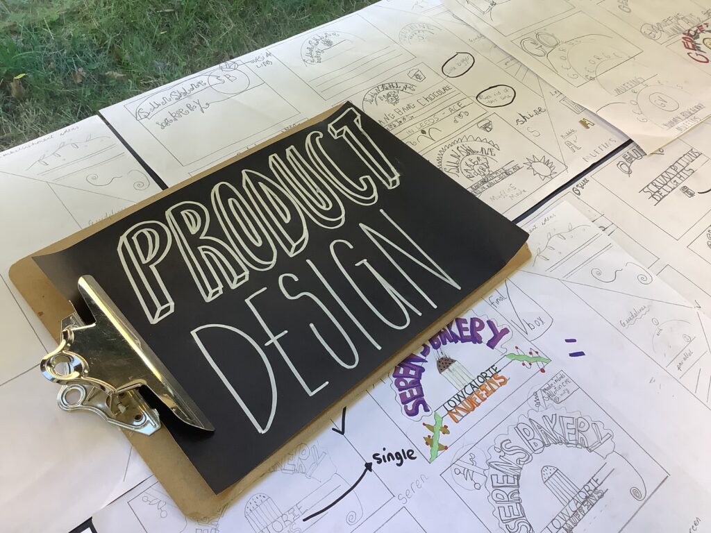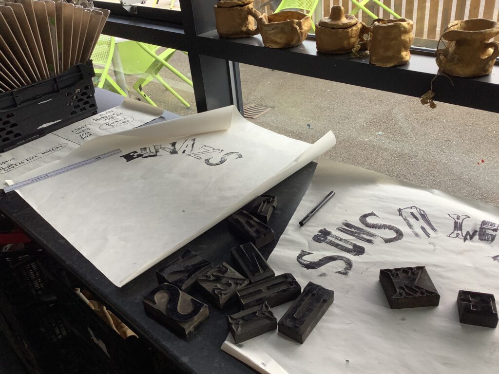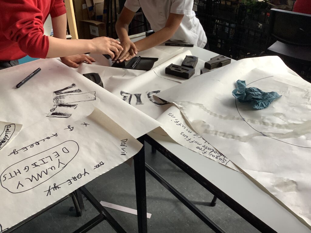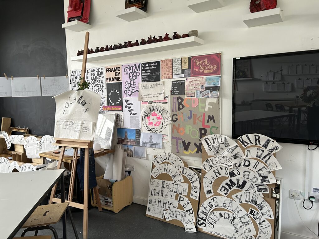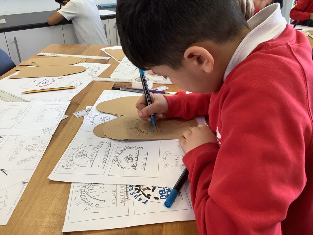 From architecture, we moved into product design and typography. In the café, the children worked with Mrs Elliott to bake either healthy blueberry or chocolate chip muffins, which became the perfect springboard for launching their own bakery businesses. They began by creating a business name and product name, before exploring existing bakeries and discussing what makes branding effective. As a first step into design, the children experimented with letterpress blocks, considering layout techniques such as arcs and parallel lines to present their business names in visually appealing ways.