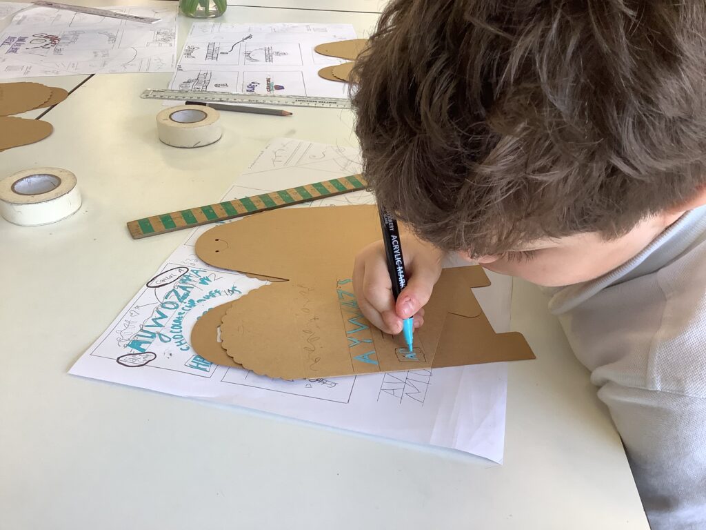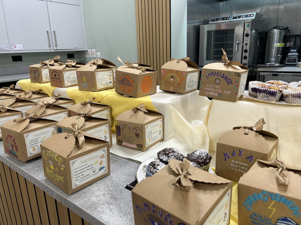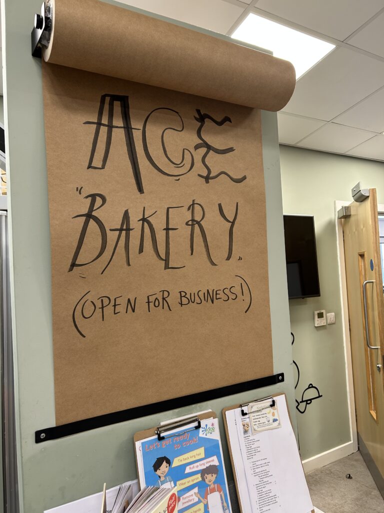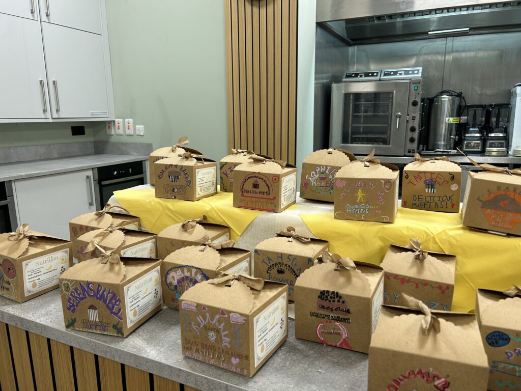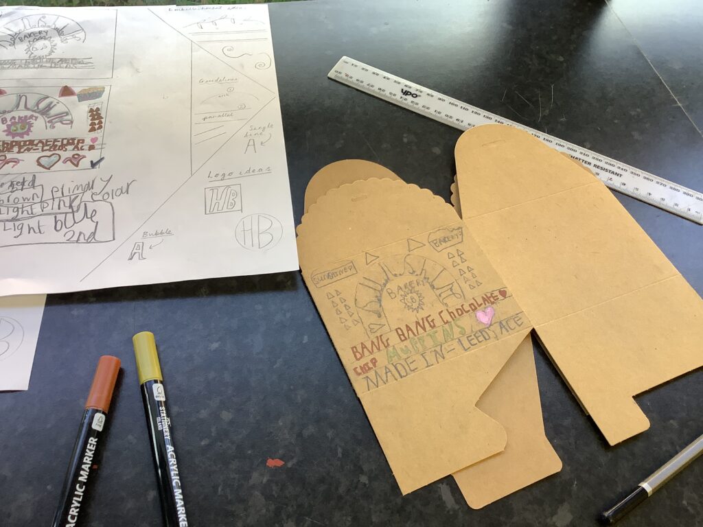 We then explored a range of Victorian and modern typography styles, kindly provided by our Leeds Beckett art department partners – thank you again! This stage was all about perseverance, reflection and improvement. The children carefully considered lettering style, size, layout and colour choices, receiving lots of individual feedback and using it to refine their work. It was wonderful to see how confidently they could articulate their design choices and next steps. Once they were happy, they used acrylic pens to create their final designs on Kraft boxes. The finished products were fantastic; they were complete with logos, nutritional information and a persuasive slogan ready to be displayed in the café for our Arts Celebration. Parents were incredibly proud and the children were thrilled to see (and taste!) their finished products. ACE Bakery was well and truly open for business!