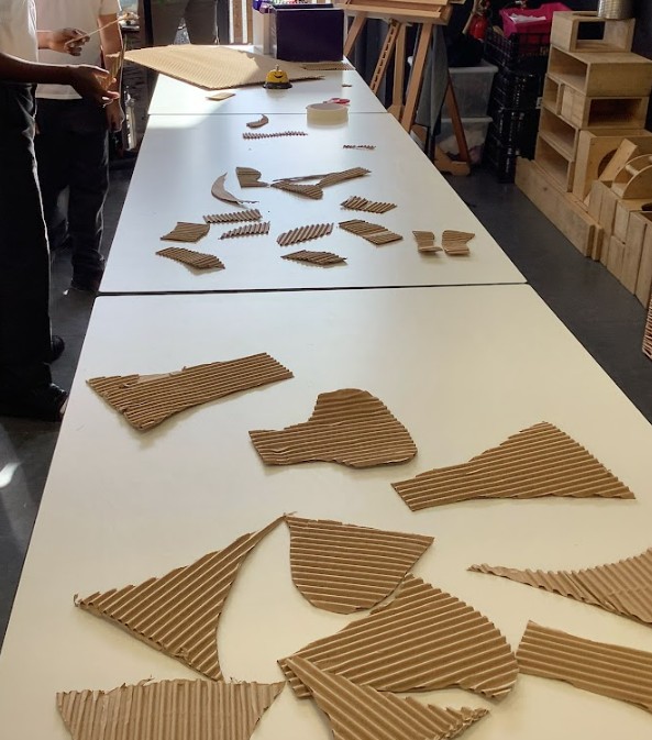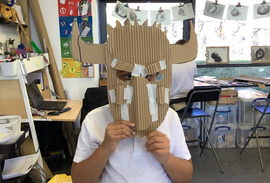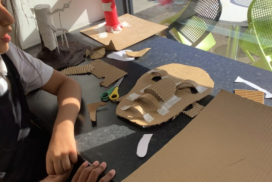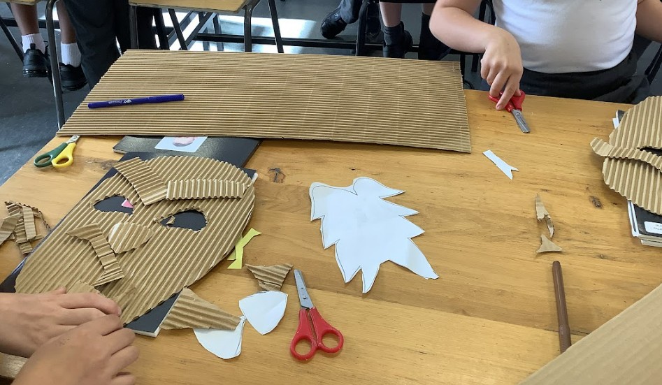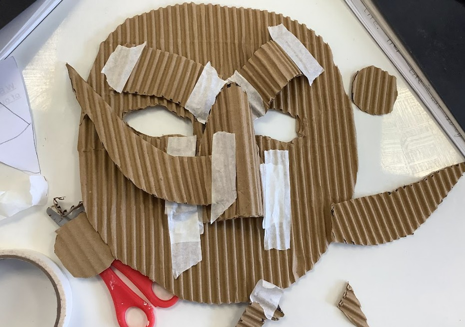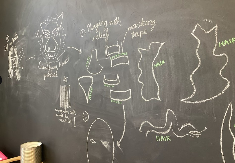 Next, we brought our 2D beast designs to life by transferring them onto corrugated card with a sturdy base. We began to build up the facial features in relief, carefully layering pieces of card and using masking tape to hold everything in place. This stage was all about experimenting with size, shape, and position, as we explored how to make the creatures’ faces look more three-dimensional and expressive.