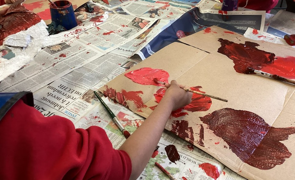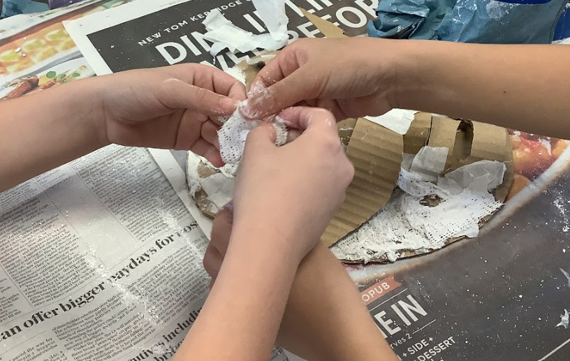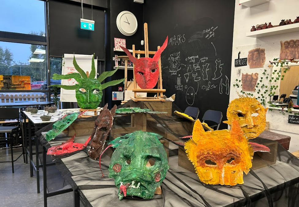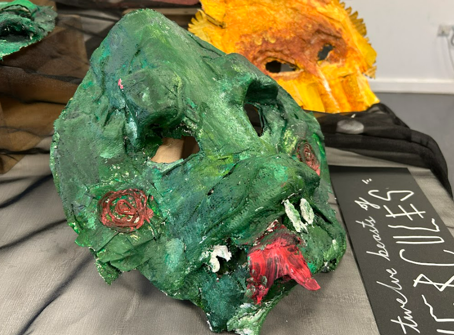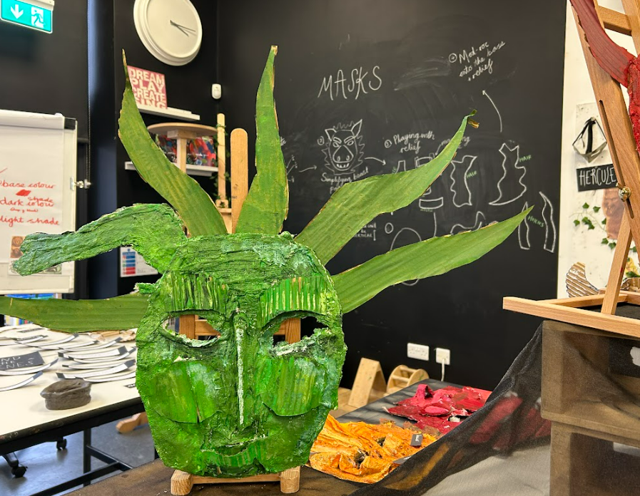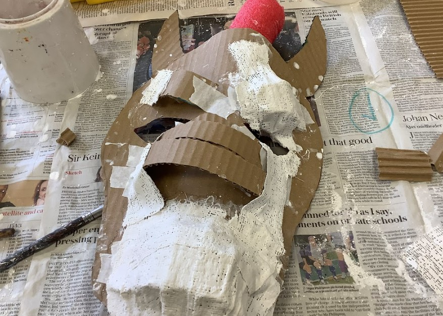 After constructing the relief forms, we applied Modroc to cover and strengthen our sculptures, learning how to layer it smoothly and evenly over the card. This was quite challenging, especially when working over areas where the relief was more pronounced. Once dry, we mixed acrylic paints to create a gradient of tones – a base shade, a lighter tone for highlights, and a darker one for shadows – to bring out the light and shade on our beast masks, giving them depth and character.