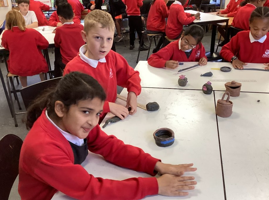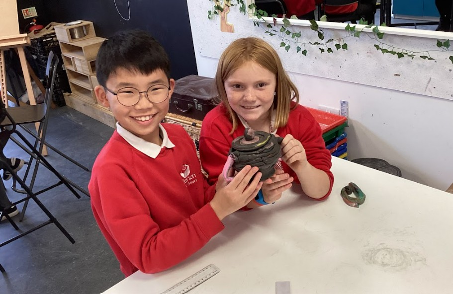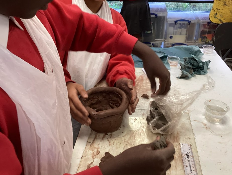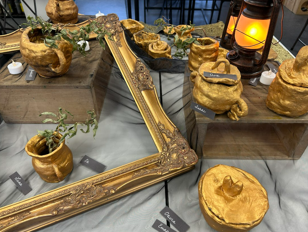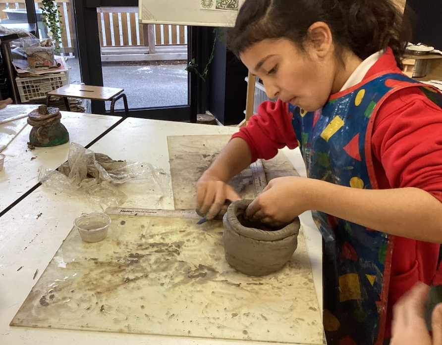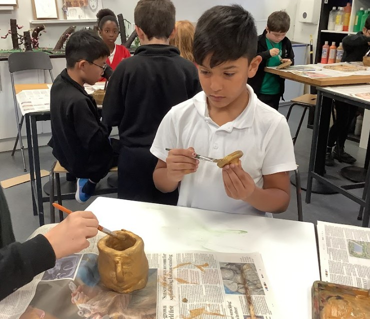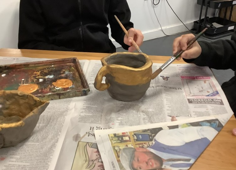Finally, we created plasticine pots to experiment with making coiled cylindrical vessels. These were prototypes, allowing us to reflect on our techniques before working with real clay. Once we were confident, we scaled up our designs using air-dried clay, applying cross-hatching and slip to join pieces securely and reduce breakage. After the pots had dried, we painted them gold to represent King Midas and his golden touch, linking our work back to the mythical themes we explored throughout the project.